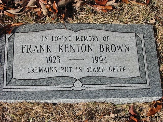 | Brown, Frank Kenton | 1923 | 1994 | Memorial, cremains put in Stamp Creek |