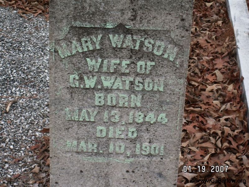 | Watson, Mary | May 13, 1844 | Mar 10, 1901 | w/o G.W. Watson |