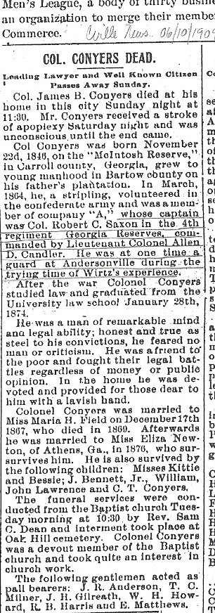 Col. Conyers Dead. Col. James B. Conyers died at his home in this city Sunday night at 11:30. Mr. Conyers received a stroke of apoplexy Saturday night and was unconscious until the end came. Col. Conyers was born November 22d, 1846, on the “McIntosh Reserve,” in Carroll county, Georgia, grew to young manhood in Bartow county on his father’s plantation. In March, 1864, he, a stripling, volunteered in the confederate army and was a member of company “A” whose captain was Col. Robert C. Saxon in the 4th regiment Georgia Reserves, commanded by Lieutenant Colonel Allen D. Candler. He was at one time a guard at Andersonville during the trying time of Wirtz’s experience. After the war Colonel Conyers studied law and graduated from the University law school January 28th, 1874. He was a man of remarkable mind and legal ability; honest and true as steel to his convictions, he feared no man or criticism. He was a friend to the poor and fought their legal battles regardless of money or public opinion. In the home he was devoted and provided for those dear to him with a lavish hand. Colonel Conyers was married to Miss Maria H. Field on December 17th 1867, who died in 1869. Afterwards he was married to Miss Eliza Newton, of Athens, Ga., in 1876, who survives him. He is also survived by the following children: Misses Kittie and Bessie; J. Bennett, Jr., William, John Lawrence and C. T. Conyers. The funeral services were conducted from the Baptist church Tuesday morning at 10:30 by Rev. Sam C. Dean and interment took place at Oak Hill cemetery. Colonel Conyers was a devout member of the Baptist church and took quite an interest in church work. The following gentlemen acted as pall bearers: J. R. Anderson, T. C. Milner, J. H. Gilreath, W. H. Howard, R. B. Harris and E. Matthews. [A tribute to Col. Conyers by the Baptist church can be found on page 1 of the August 12, 1909 issue.] |