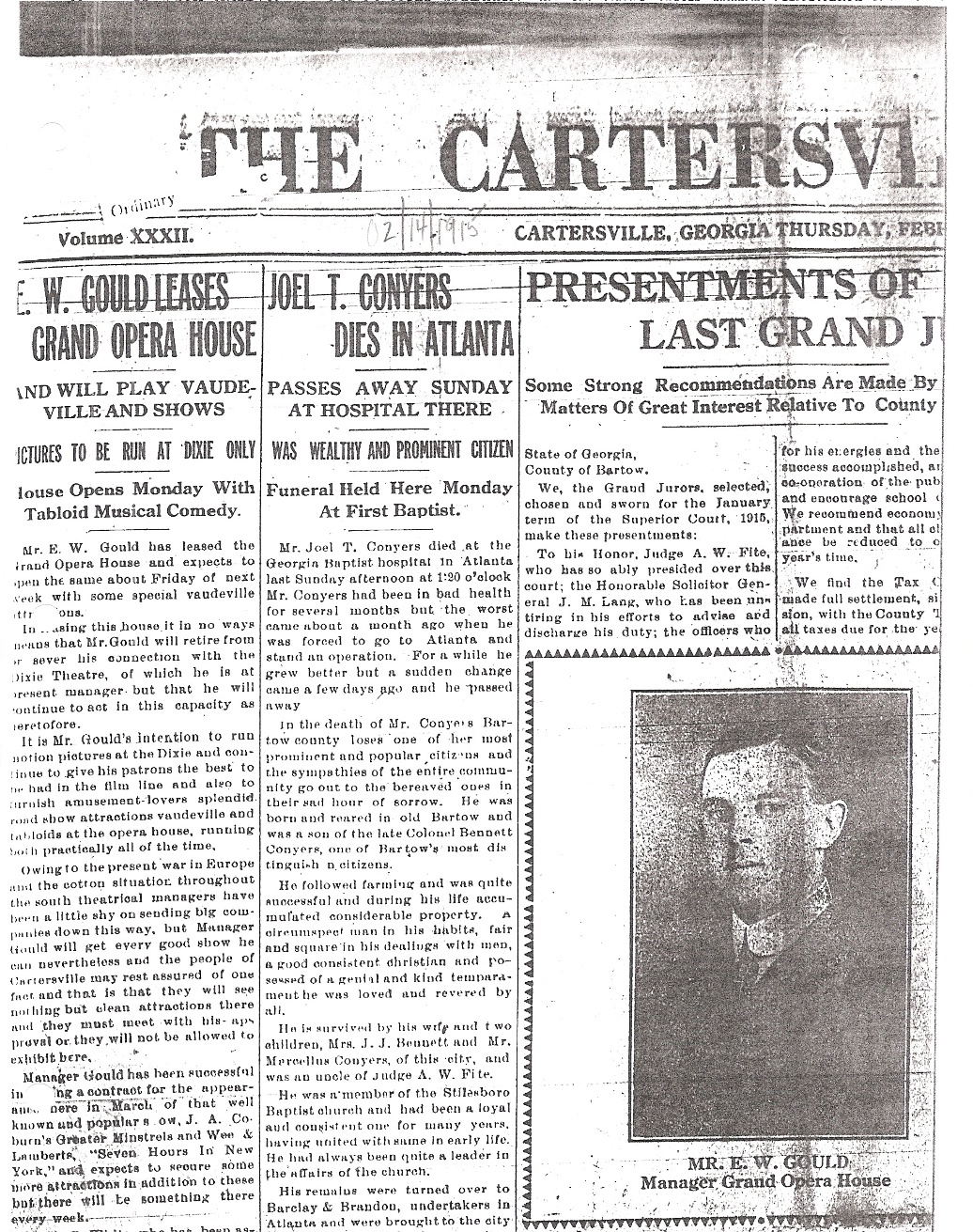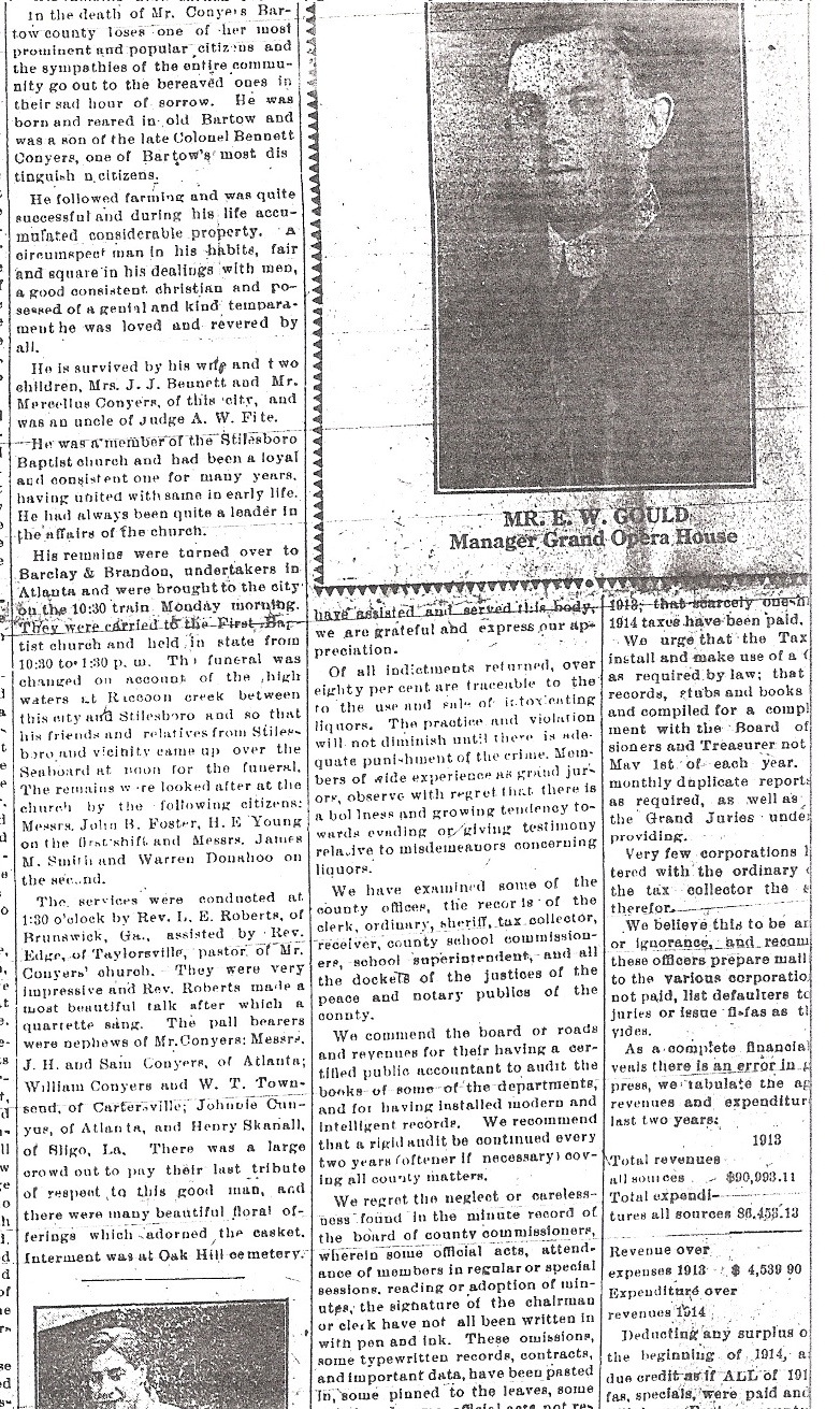 Joel T. Conyers Dies In Atlanta Mr. Joel T. Conyers died at the Georgia Baptist Hospital in Atlanta last Sunday afternoon at 1:20 o’clock. Mr. Conyers had been in bad health for several months but the worst came about a month ago when he was forced to go to Atlanta and stand an operation. For a while he grew better but a sudden change came a few days ago and he passed away. In the death of Mr. Conyers Bartow county losses on of her most prominent and popular citizens and the sympathies of the entire community go out to the bereaved ones in their sad hour of sorrow. He was born and reared in old Bartow and was a son of the late Colonel Bennett Conyers, one of Bartow’s most distinguished citizens. He followed farming and was quite successful and during his life accumulated considerable property. A circumspect man in his habits, fair and square in his dealings with men, a good consistent christian and possessed a genial and kind temperament he was loved and revered by all. He is survived by his wife and two children, Mrs. J. J. Bennett and Mr. Marcellus Conyers, of this city and was an uncle of Judge A. W. Fite. He was a member of the Stilesboro Baptist church and had been a loyal and constant one for many years, having united the same in early life. He had always been quite a leader in the affairs of the church. His remain were turned over to Barclay & Brandon, undertakers in Atlanta and were brought to this city on the 10:30 train Monday morning. They were carried to the First Baptist Church and held in state from 10:30 to 1:30 p.m. The funeral was changed on account of high waters at Raccoon creek between this city and Stilesboro and so that his friends and relatives from Stilesboro and vicinity came up over the Seaboard at noon for the funeral. The remains were looked after at the church by the following citizens; Messrs. John B. Foster, H.E. Young on the first shift and Messrs. James M. Smith and Warren Donahoo on the second. The services were conducted at 1:30 o’clock by Rev. L. E. Roberts, of Brunswick, Ga. Assisted by Rev. Edge of Taylorsville, pastor of Conyers’ church. They were very impressive and Rev. Roberts made a beautiful talk after which a quarrette sang. The pall bearers were the nephews of Mr. Conyers: Messrs. J.H. and Sam Conyers, of Atlanta; William Conyers and W.T. Townsend, of Cartersville, Johnnie Cunyus, of Atlanta, and Henry Skanall, of Silgo, La. There was a large crowd out to pay their last tribute of respect to this good man, and there were many beautiful floral offerings which adorned the casket. Interment was at Oak Hill cemetery