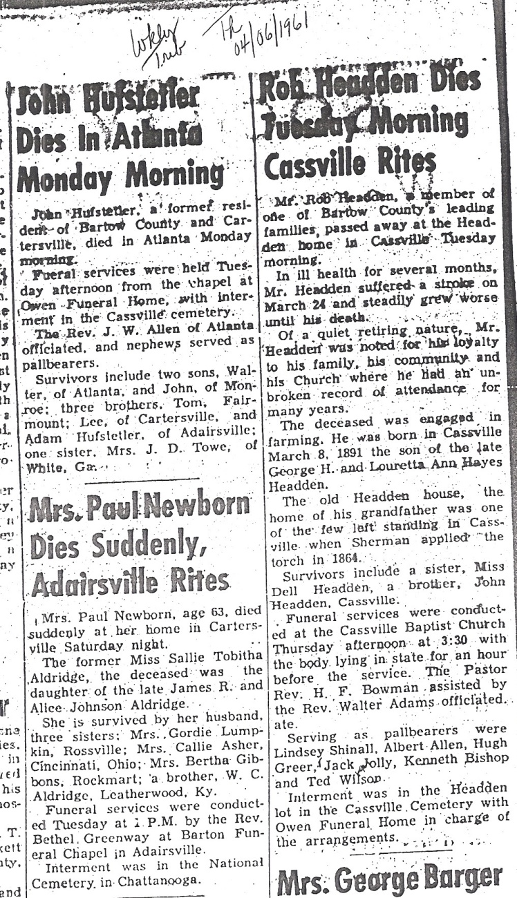 John Hufstetler Dies in Atlanta Monday Morning John Hufstetler, a former resident of Bartow County and Cartersville, died in Atlanta Monday morning. Funeral services were held Tuesday afternoon from the chapel at Owen Funeral Home, with interment in the Cassville cemetery. The Rev. J.W. Allen of Atlanta officiated, and nephews served as pallbearers. Survivors include two sons, Walter, of Atlanta, and John, of Monroe; three brothers, Tom, Fairmount; Lee, of Cartersville, and Adam Hufstetler, of Adairsville; one sister, Mrs. J.D. Towe, of White, Ga. |