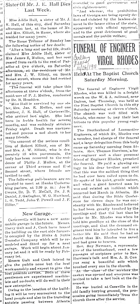 Funeral of Engineer Virgil Rhodes The funeral of Engineer Virgil Rhodes, who was killed in a freight wreck on the W. & A. railroad, near Dalton, last Thursday, was held at the First Baptist Church in this city Saturday morning at eleven o’clock. The church was well filled with friends, who came to pay their last tribute to this popular young engineer. The Brotherhood of Locomotive Engineers, of which Mr. Rhodes was a member, had charge of the funeral and a large delegation from this body came up Saturday morning from Atlanta. Rev. Thomas Harrison, a former engineer and a close personal friend of Engineer Rhodes, preached the funeral. He paid a glowing eulogy to his dear brother and said that this was the saddest thing that he had ever been called upon to do. He spoke of his quiet, gentle nature, and what a good hearted man he was and related an incident which occurred last March in Atlanta. He said that during the Bible Conference for eleven days he was constantly with Mr. Rhodes and believed he had been greatly touched by the meetings and that the last time he spoke with Mr. Rhodes was when he told him goodbye at the close of the meetings, and that the deceased engineer told him he intended to live a better life. He said that he had no doubt that Mr. Rhodes was saved and had gone to heaven. Rev. Roy Newman, a representative of the brotherhood, read a few passages of scripture prior to Rev. Harrison’s talk and Mrs. A.B. Cunyus sang a beautiful solo which touched every one in the church. At the close of the services, the casket was opened and everyone was invited to take a last look at the deceased. He was buried at Cassville in the old family burying ground, the procession going immediately from the church there after the service. |