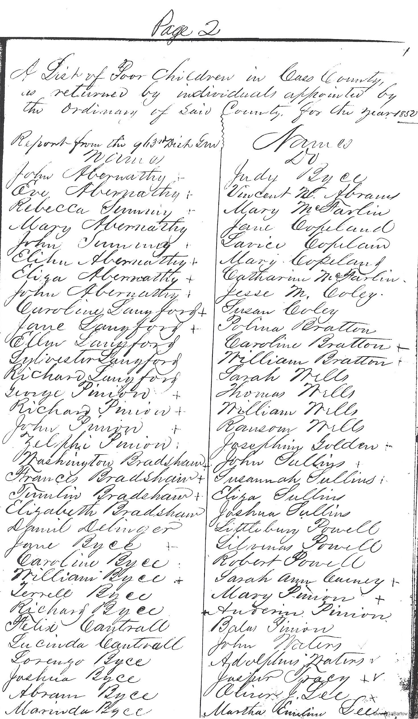 | List of he names of The Poor Children in The 828th District Ga ML Cass County entitled for The benefit of The Poor School fund. | 61 | 1857 | Pender, Mary | |
