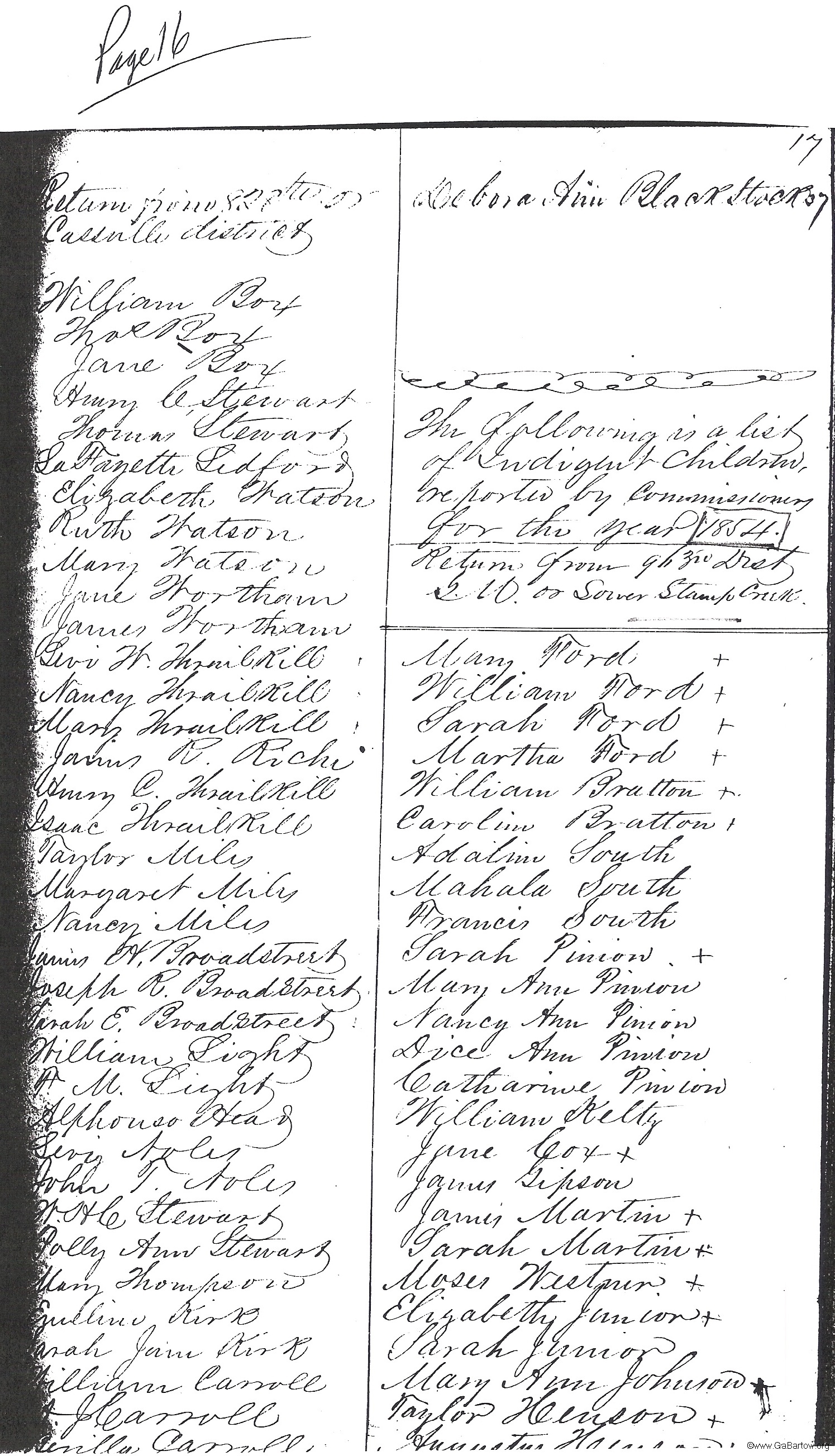 | List of Indigent children, reported by commissioners for the year 1854; return from 963rd Dist GM or Lower Stamp Creek | 16 | 1854 | Pinion, Sarah | |