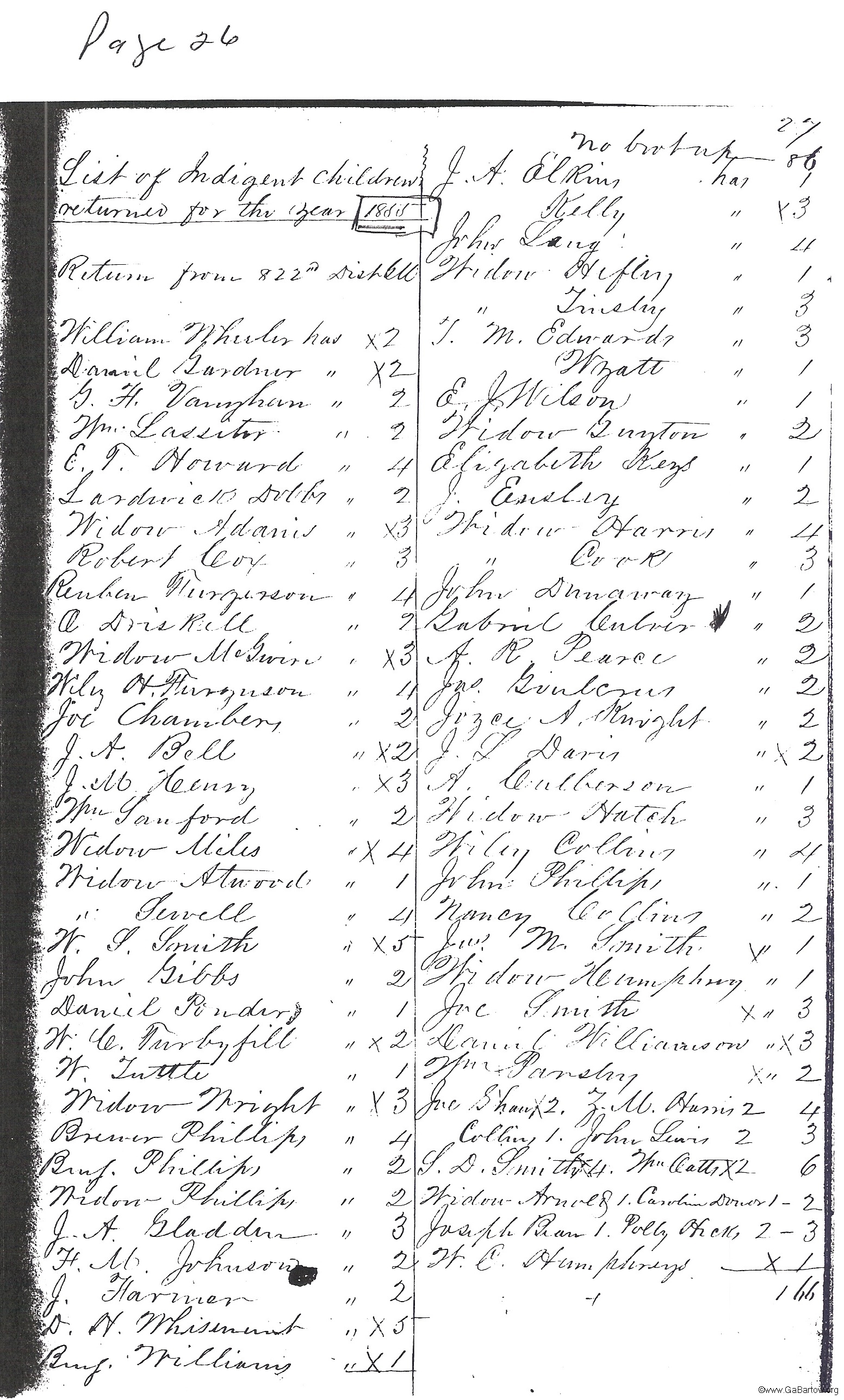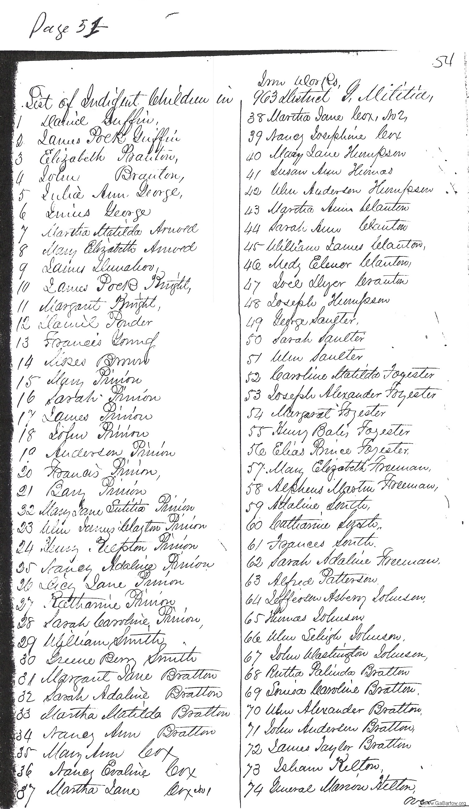 | List of indigent children returned from 856 Dist, Adairsville | 55 | 1857 | Pully, M.E. | |