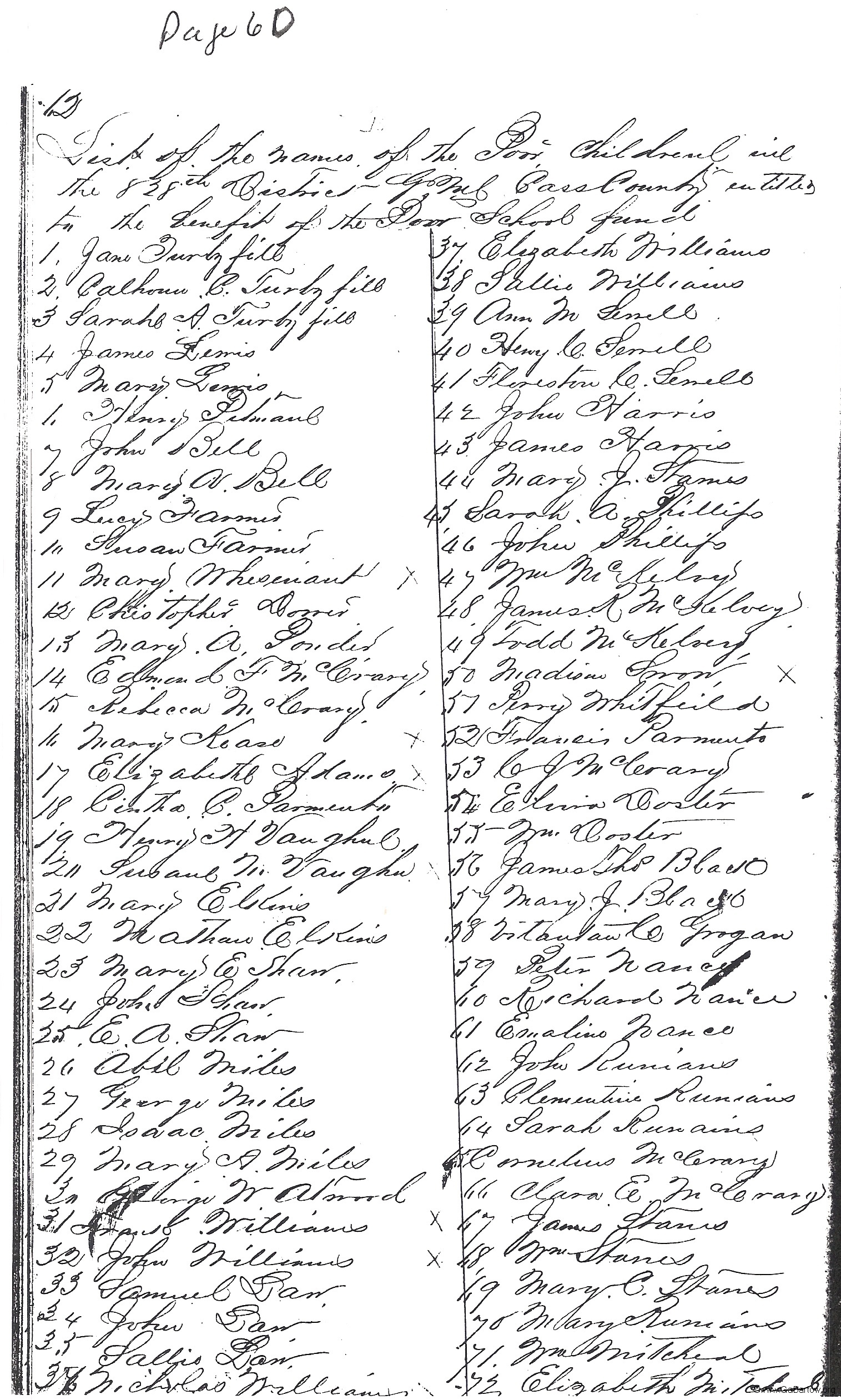 | List of he names of The Poor Children in The 828th District Ga ML Cass County entitled for The benefit of The Poor School fund. | 61 | 1857 | Pender, Fanny | |